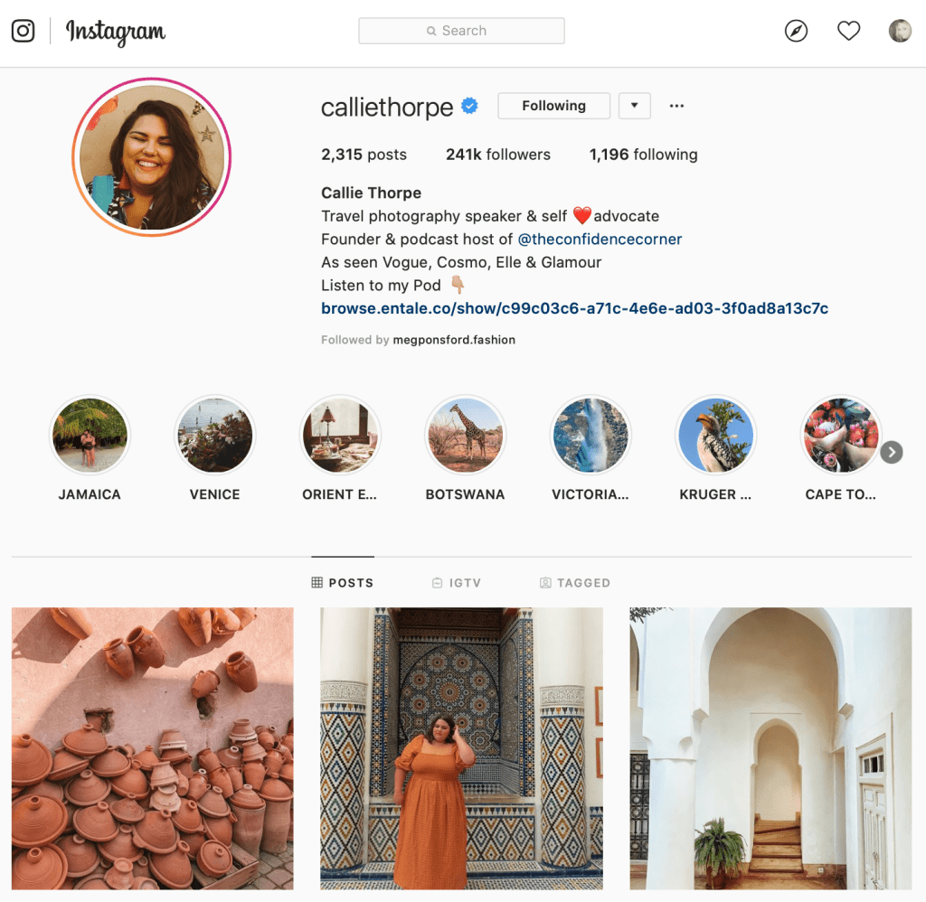 She inspires me to be more adventurous with my clothing choices rather than sticking with the clothing I am comfortable with. She also makes me feel more confident within myself especially with her podcast she has called the confidence corner. On her podcasts she has a different guest on each one talking about different topics but mainly about boosting people’s confidence. One of her podcasts she discusses about comparing yourself to other people for their bodies, jobs and travels and how to cope and overcome these things. Her guests give a very personal insight to their stories and lives and give advice if anyone perhaps is going through anything similar how to get past their problem. Her Instagram posts also inspire me to not care too much about if I should or shouldn’t wear something due to my size as she always wears clothing that I would never dare to wear but she has the confidence to do so. This then gives me some confidence to as I think if Callie Thorpe can do it why can’t I?